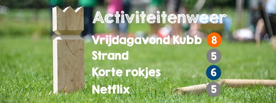 Aanstaande vrijdag is het alweer de laatste vrijdag van de maand. En dus de hoogte tijd is voor Vrijdagavond Kubb. Hoewel het wat onwaarschijnlijk klinkt, wordt het vrijdag gewoon prima weer voor een potje Kubb. We beginnen om half negen. Tot dan!