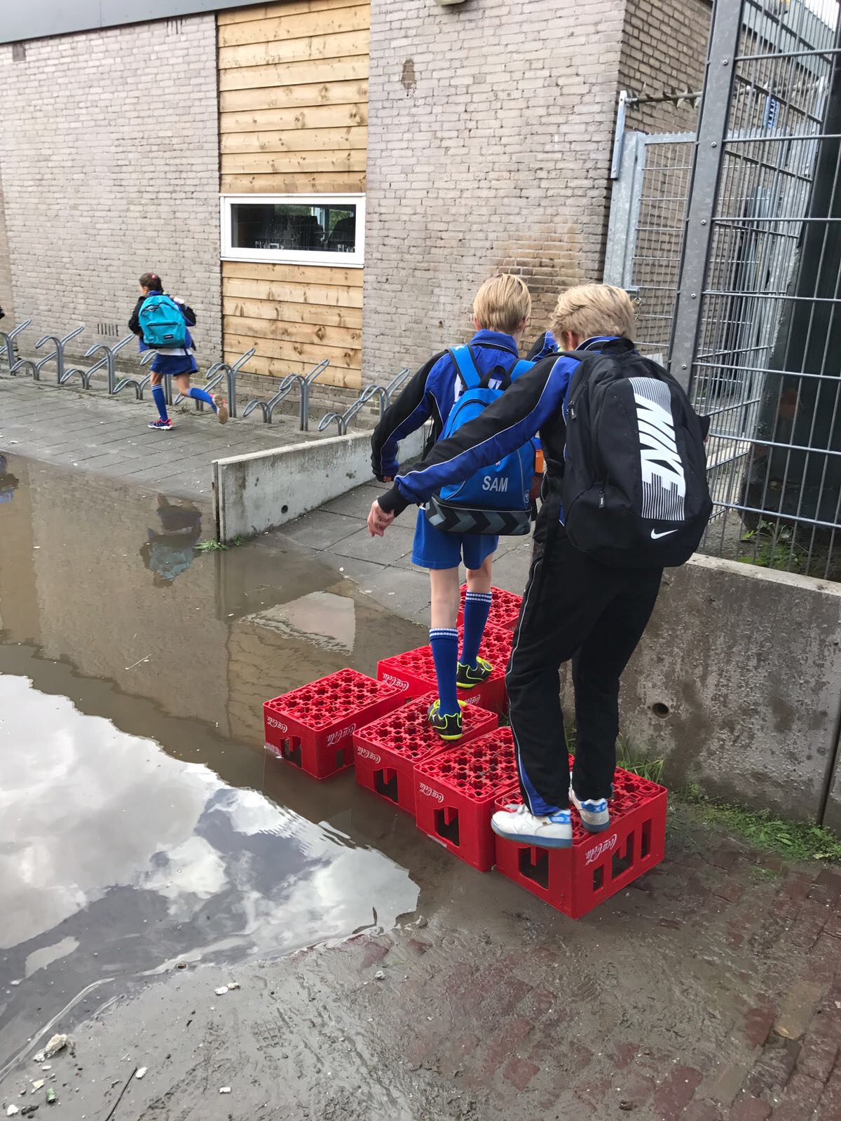Door de hoeveelheid regen die was gevallen konden we het veld alleen bereiken door over kratten heen te lopen.