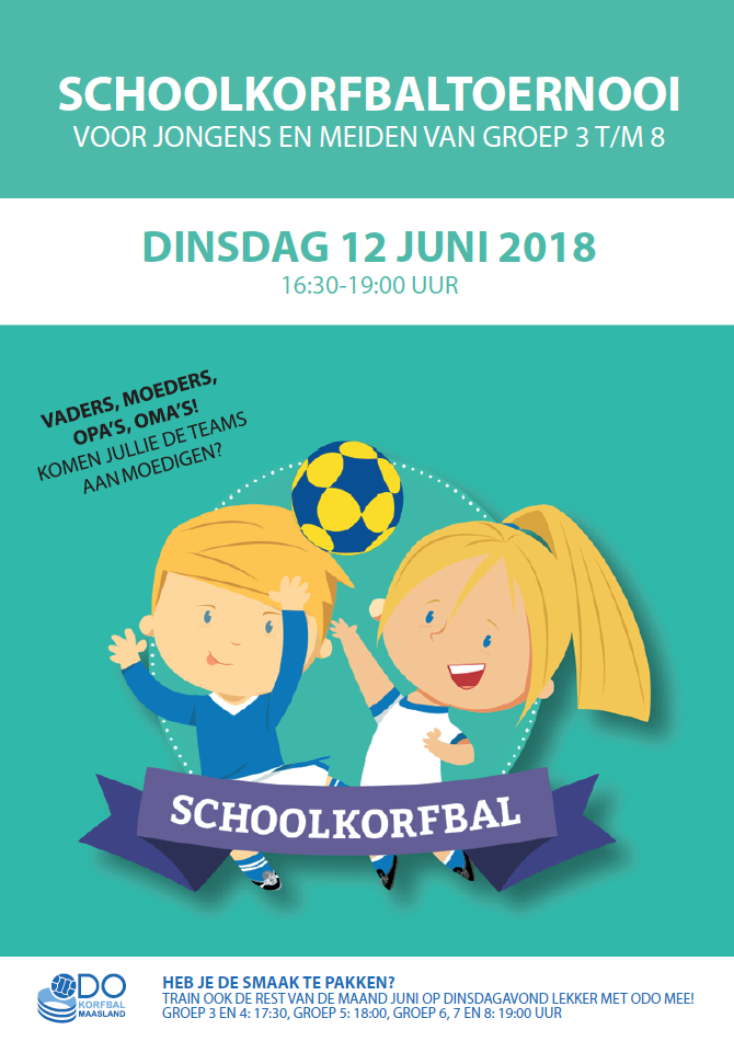 Maasland, 4 juni 2018 – Op dinsdag 12 juni organiseert de Maaslandse korfbalvereniging ODO voor de 46e keer het schoolkorfbaltoernooi. Het toernooi vindt plaats op het sportcomplex aan de Baanderheer en duurt van 16:30 tot 19:00 uur. ODO organiseert het toernooi om nog meer jeugd voor korfbal te enthousiasmeren en hoopt onbekend Maaslands korfbaltalent te ontdekken.