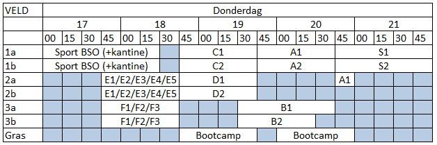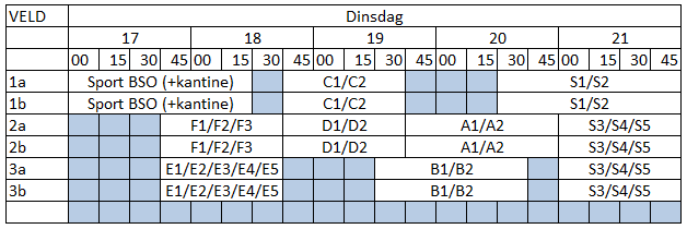 Vanaf maandag 3 september 2018 gelden de onderstaande schema’s voor de Veldperiode najaar 2018!