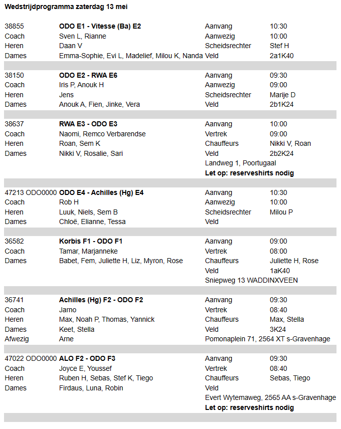 Wedstrijdopstellingen E/F teams, zaterdag 13 mei
