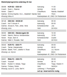 Hierbij weer de wedstrijdopstellingen voor de E en de F teams van zaterdag 20 mei. Niet alle teams spelen dit weekend. Let op: rijbeurten graag onderling ruilen, mocht het niet uitkomen. Fijne week!