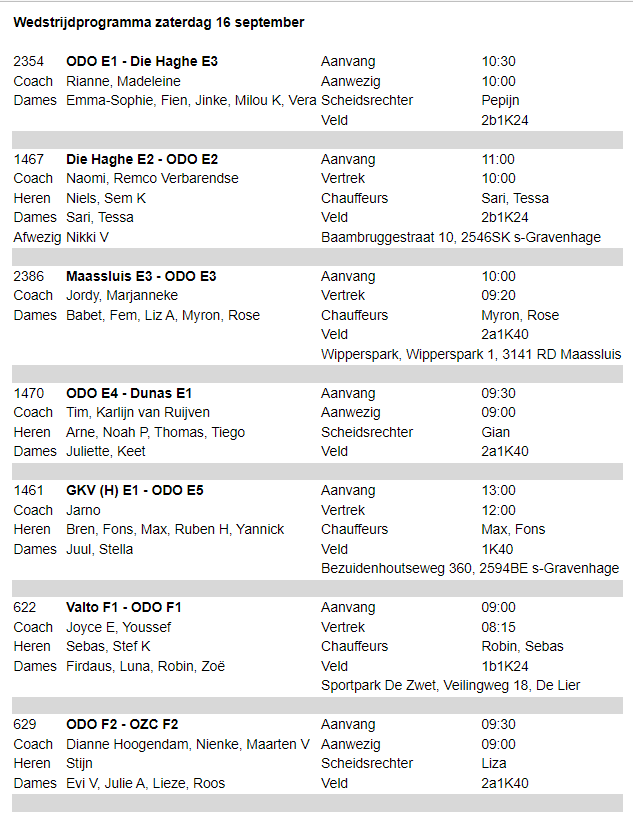 Hierbij de wedstrijdopstellingen voor zaterdag 16 september!