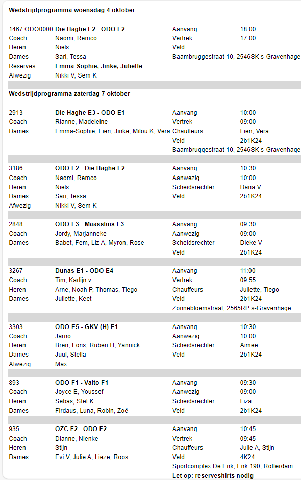 Wedstrijdopstellingen E en F teams, woensdag 4 oktober en zaterdag 7 oktober