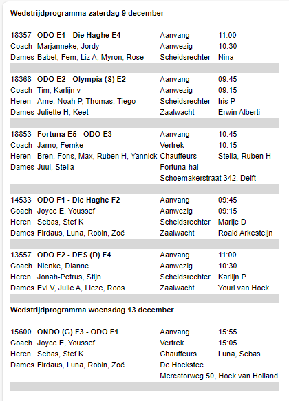 Hierbij weer de opstellingen voor a.s. zaterdag 9 december en een extra inhaalwedstrijd voor de F1 op woensdag 13 december.
