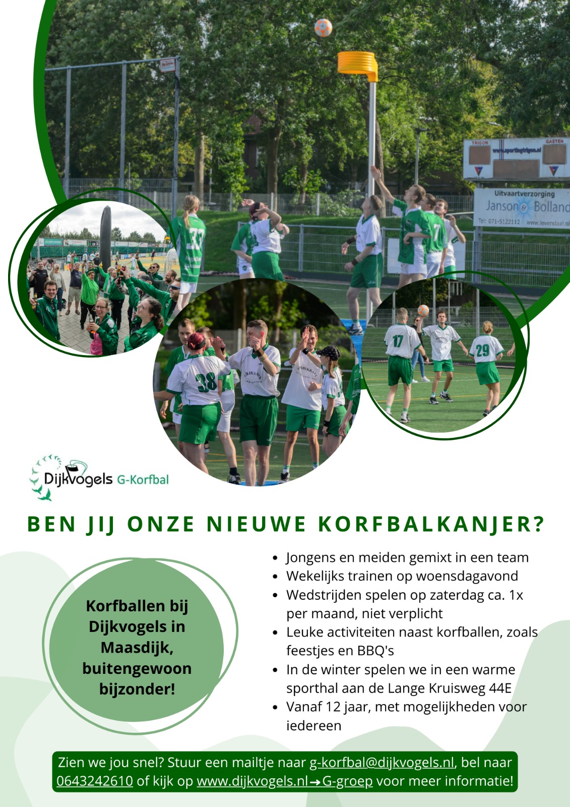 Korfbalvereniging Dijkvogels uit Maasdijk is in 1997 begonnen met het opstarten van een G-team. Een G-team bestaat uit spelers met een verstandelijke en/of deels lichamelijke beperking. Er zijn nu 28 enthousiaste leden die wekelijks actief spelen in de zaal en op het veld. Ze komen allemaal uit de omtrek van het Westland en Maassluis. De leeftijd is van 18 tot 60 jaar, maar jonger is ook zeker welkom.
