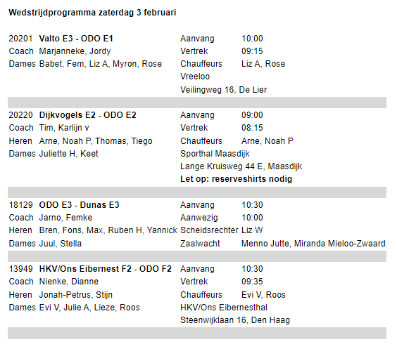 Wedstrijdopstellingen E en F teams, zaterdag 3 februari