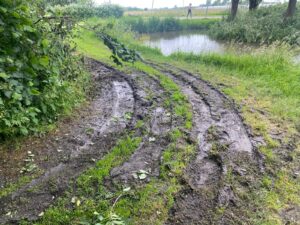 Na het maaien van ons veld bleek dat de trekker grote sporen had achtergelaten bij de ingang van het veld. De grond is zo nat dat dit ook niet snel droog zal worden. Het leek ons onverantwoord om alle lopers over dit zeer modderige stukje te laten gaan. Volgend jaar proberen we het weer! ODO verzorgt overigens wel de tweede stempelpost op dinsdagavond, dus we zullen veel van jullie tegenkomen. Voor iedereen die deze week de 4daagse gaat lopen: heel veel plezier!