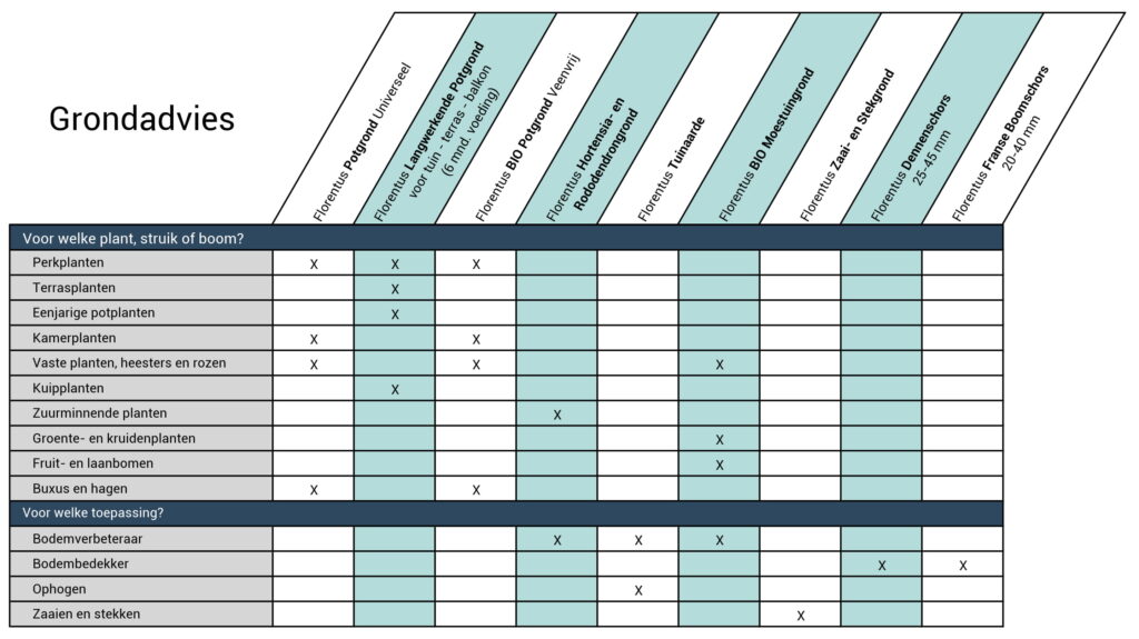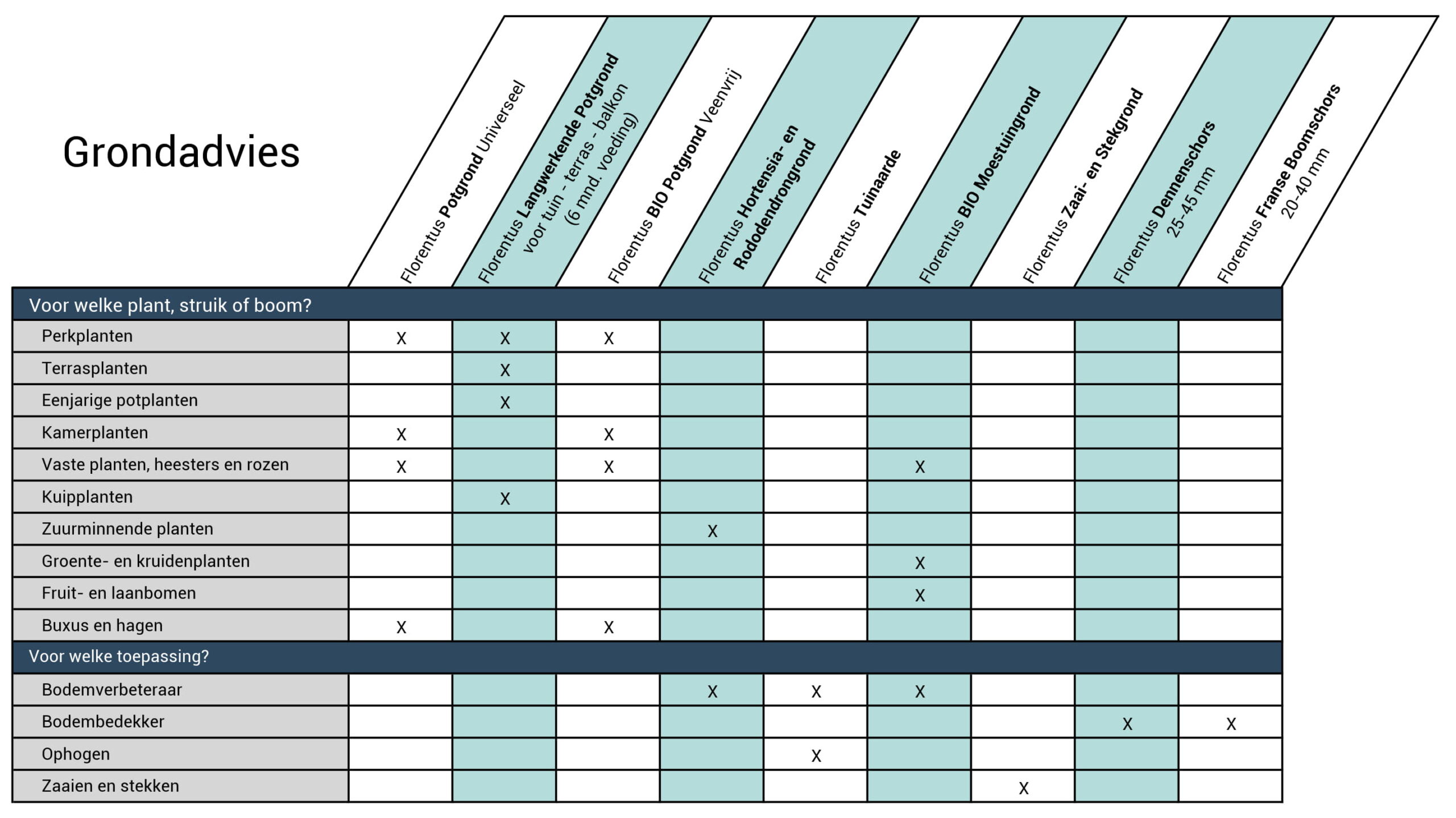 Grondadvies helpt u bij het maken van de juiste keuze! De tabel laat zien waar de producten van elkaar verschillen en voor welke toepassing ze kunnen worden ingezet. Zoek links in de tabel de beoogde toepassing op en kijk dan welk product het beste aansluit op uw wensen.